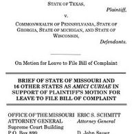 12/9/20: by Attorney General Eric Schmitt: A coalition of 17 state attorneys general, led by Missouri Attorney General Eric Schmitt, filed an amicus brief in the State of Texas v. Commonwealth of Pennsylvania, State of Georgia, State of Michigan and State of Wisconsin to urge the Court to grant Texas leave to file their original action.